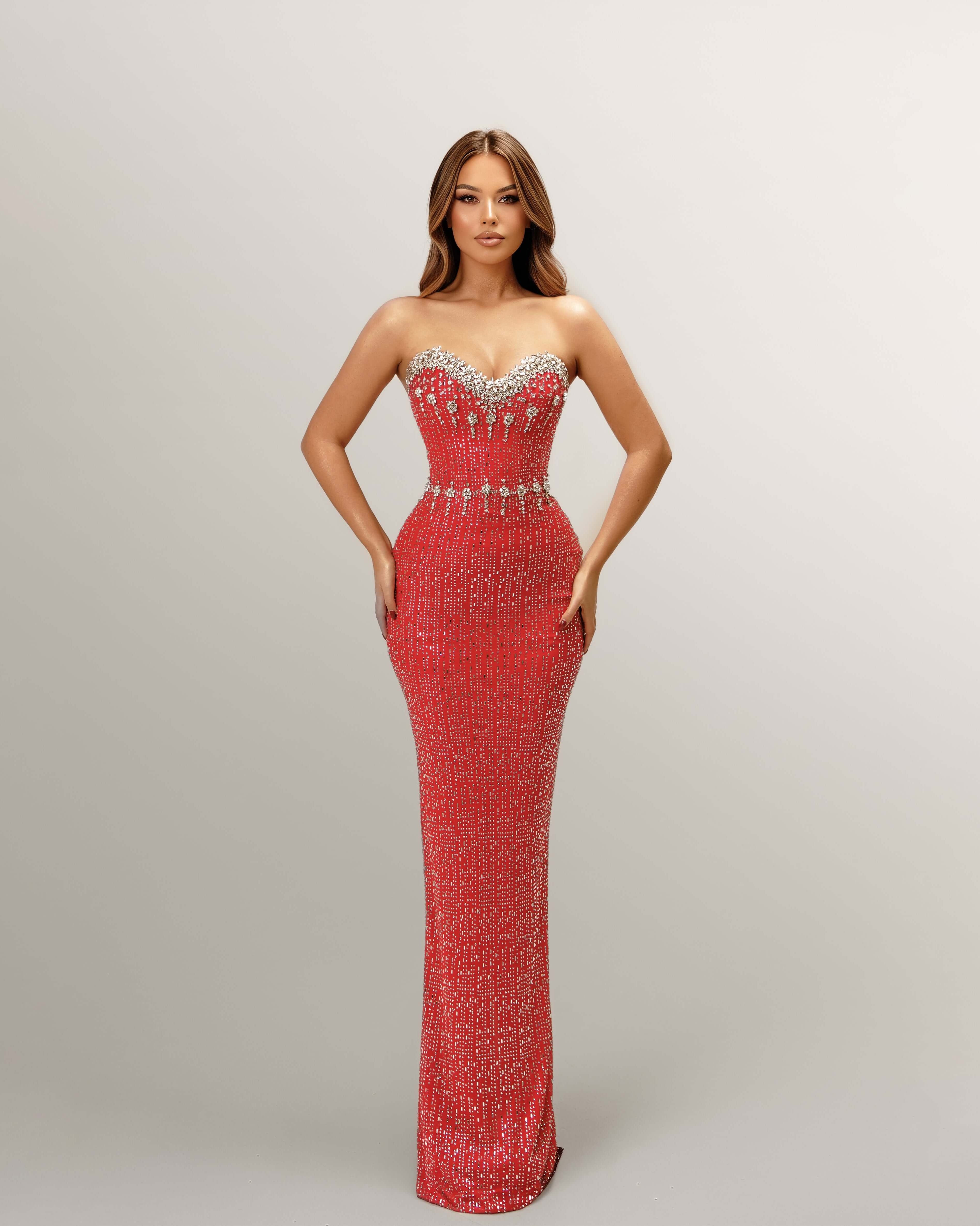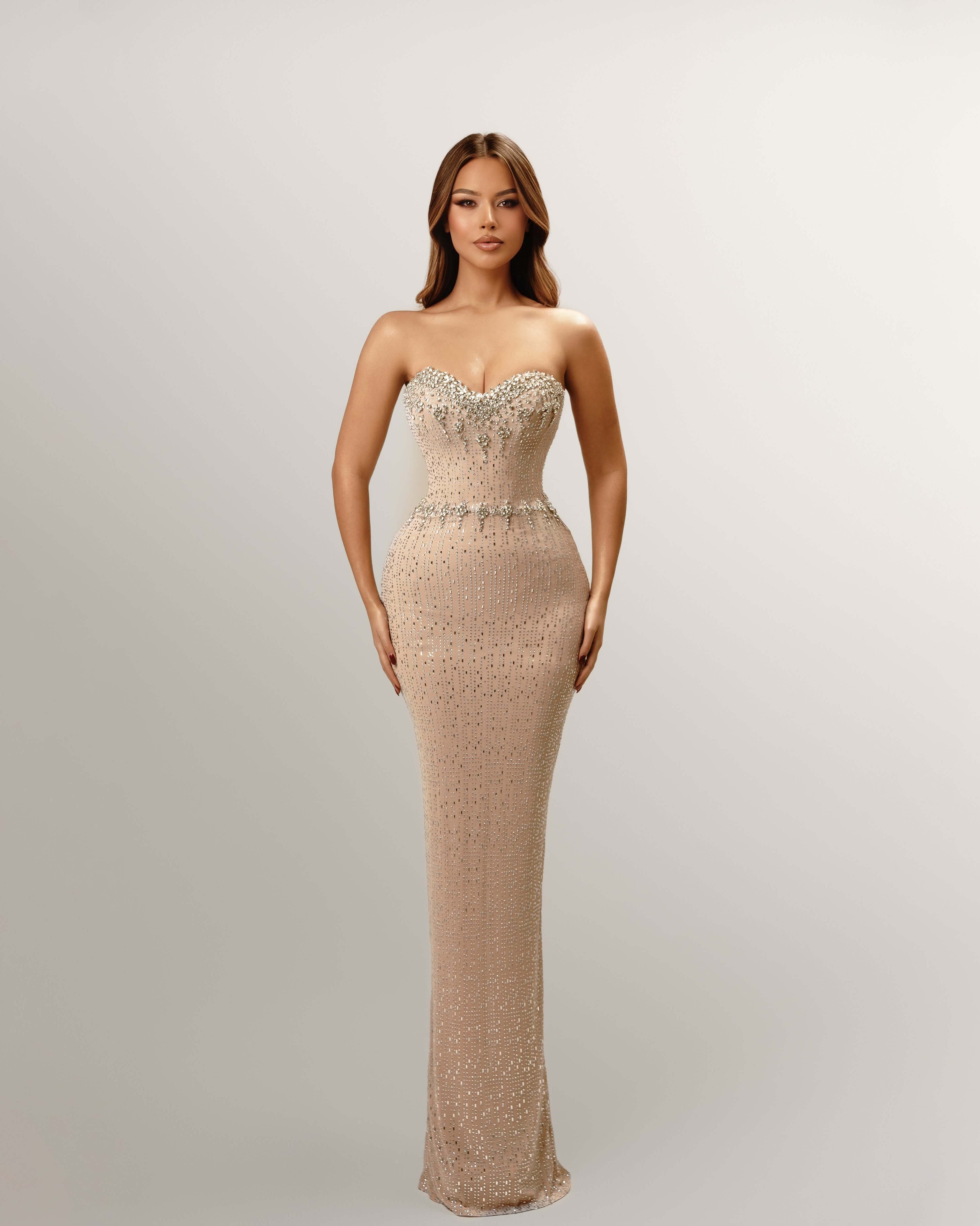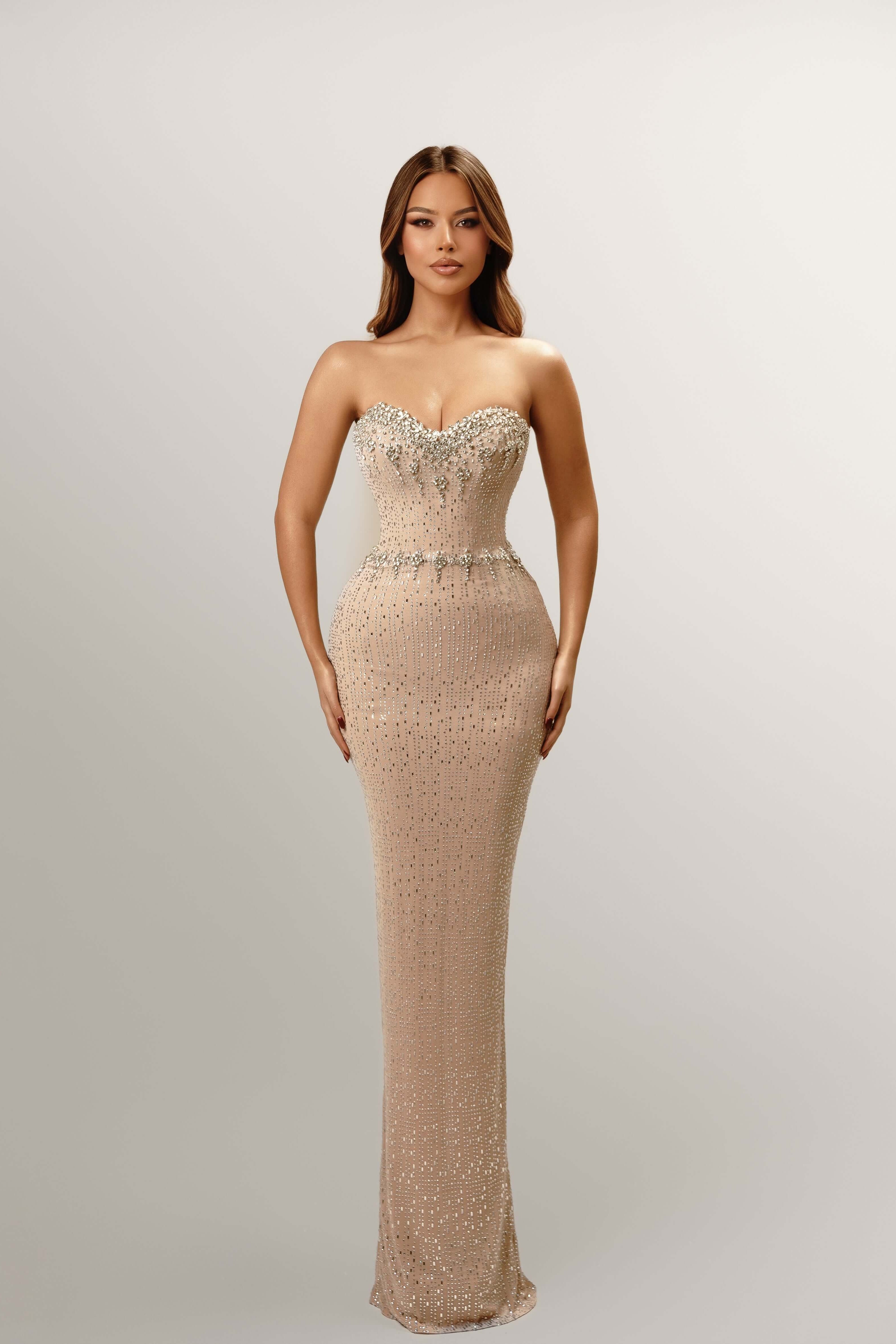 Make a lasting impression in this glamorous evening gown, designed with a structured corset bodice and a flattering sweetheart neckline